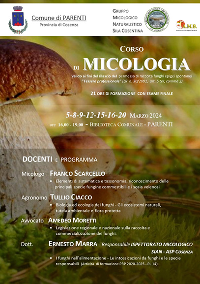 Corso di Micologia valido ai fini del permesso di raccolta funghi epigei spontanei "Tessera Professionale". 21 ore di formazione con esame finale. ore 16:00 - 19:00 Bibblioteca Comunale - Parenti.